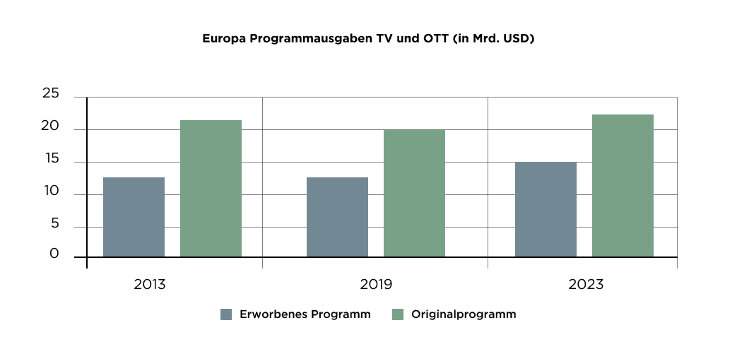 2020 wurde Netflix der grösste Produzent von Originalinhalten in Europa. Dies führte dazu, dass globale OTT-Dienste in der Region reguliert wurden, um die etablierten lokalen Sender und Verleihe zu schützen. Die Richtlinie über audiovisuelle Mediendienste erlaubt jedem europäischen Land den Erlass von Gesetzen, die OTT-Plattformen dazu verpflichten, bis zu 30% ihrer Einnahmen für die Produktion europäischer Originalinhalte auszugeben. Frankreich wird voraussichtlich zu den ersten Ländern in Europa gehören, die OTT-Dienste gesetzlich verpflichten, 25% auszugeben und ihre Ausgaben für digitale Plattformen von EUR 50 Mio. im Jahr 2019 auf EUR 400 Mio. im Jahr 2024 zu erhöhen. Auch in Deutschland steigt die Nachfrage nach lokalen Inhalten, da in den USA produzierte Inhalte für ein deutsches Publikum immer weniger relevant werden.