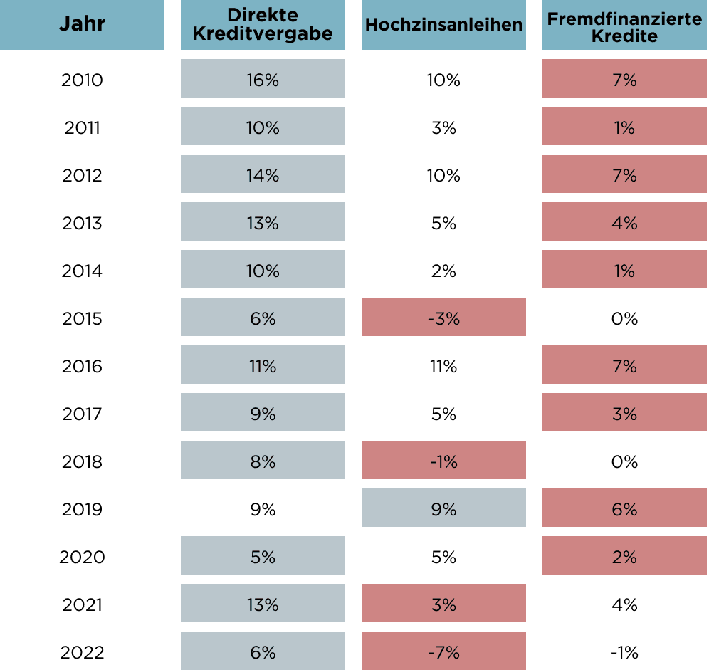 Höhere Leitzinsen sind nützlich, da Direktkredite im Gegensatz zu den festen Zinssätzen für öffentliche Anleihen in der Regel variabel verzinst werden. Darüber hinaus schwankt der Wert der Privatdarlehen nicht so stark wie bei fremdfinanzierten Darlehen oder traditionellen Anleihen, die sich in den letzten zwei Jahren aufgrund der gestiegenen Zinssätze als besonders volatil erwiesen haben. Diese niedrigeren Volatilitätsniveaus sind in der folgenden Tabelle dargestellt.