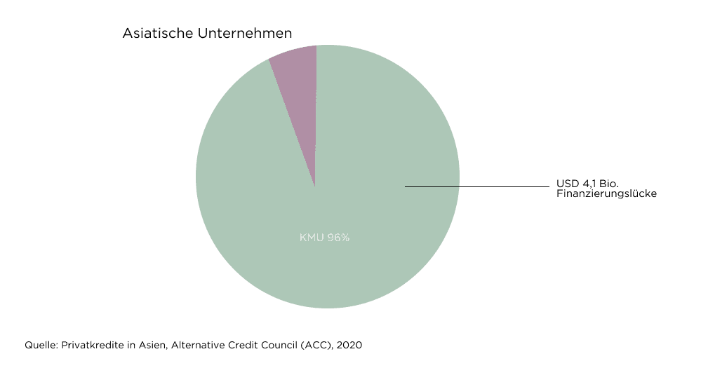 Nach Schätzungen des Alternative Credit Council (ACC) machen KMU 96% aller Unternehmen in Asien aus und sind der wichtigste Motor für Beschäftigung und BIP-Wachstum. Aufgrund des starren finanziellen Ökosystems und des regulatorischen Umfelds haben sie jedoch Schwierigkeiten, eine traditionelle Finanzierung bei Banken zu erhalten. Schätzungen zufolge bestand im Jahr 2019 in der Region eine Finanzierungslücke von USD 4,1 Bio. für KMU.