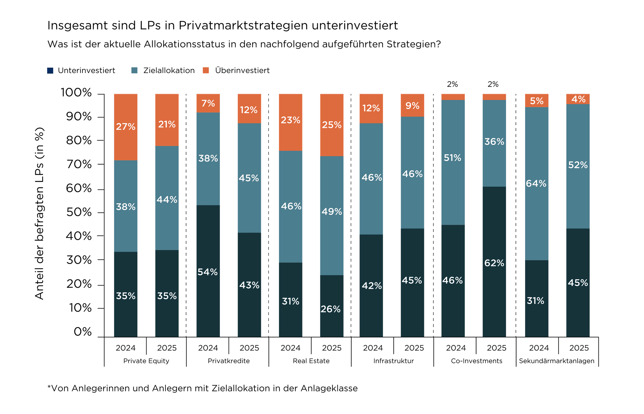Die jüngste Flaute im Private-Equity-Sektor hat dazu geführt, dass viele Fonds in dieser Anlageklasse unterinvestiert sind. Demnach ist ein stetiger Kapitalzufluss in naher Zukunft zu erwarten, wenn die Anlegerinnen und Anleger in diesen Bereich zurückkehren.