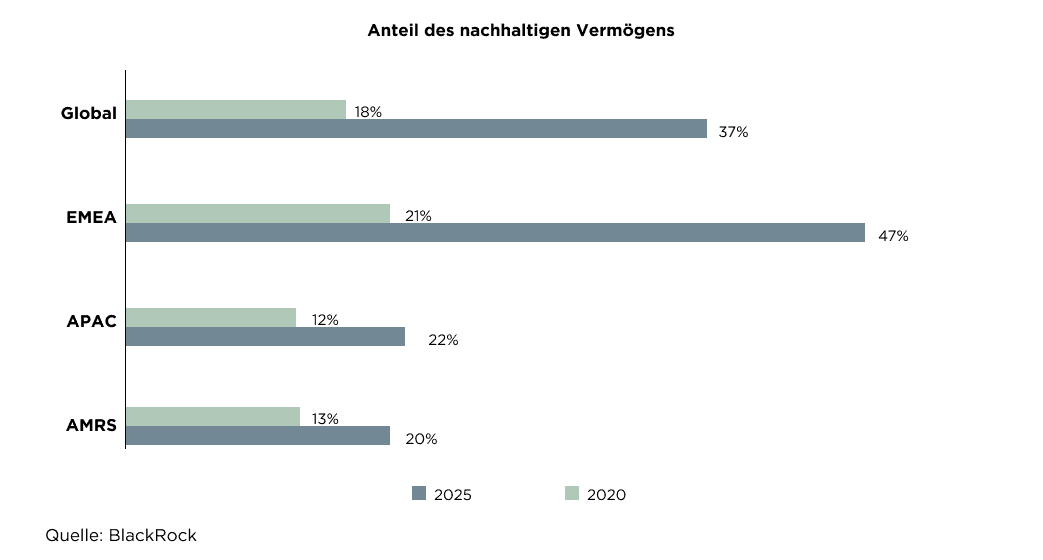 Aus der Umfrage von BlackRock geht auch hervor, dass die Befragten, die insgesamt ein geschätztes verwaltetes Vermögen von USD 25 Bio. repräsentieren, den Anteil des nachhaltig verwalteten Vermögens in den nächsten fünf Jahren verdoppeln wollen – von 18% auf 37% im Jahr 2025.