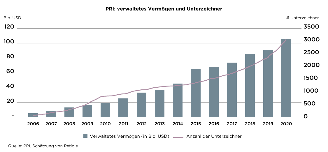 Die PRI werden von den Vereinten Nationen unterstützt und sind mit mehr als 3’900 Unterzeichnern in über 60 Ländern, die insgesamt ein Vermögen im Wert von über USD 100 Bio. verwalten, eine weltweit führende Kraft bei der Förderung des verantwortlichen Investierens. Verantwortliches Investieren beruht auf der Erkenntnis, dass langfristiger Wohlstand eine Abkehr von der kurzfristigen Gewinnmaximierung als einzigem Anlagezweck erfordert. Es handelt sich um eine Anlagestrategie, die Umwelt-, Sozial- und Governance-Faktoren (Environmental, Social and Governance, ESG) in Anlageanalyse und Anlageentscheidungen einbezieht und die nachhaltige Gesundheit und Stabilität des Marktes als Ganzes berücksichtigt.