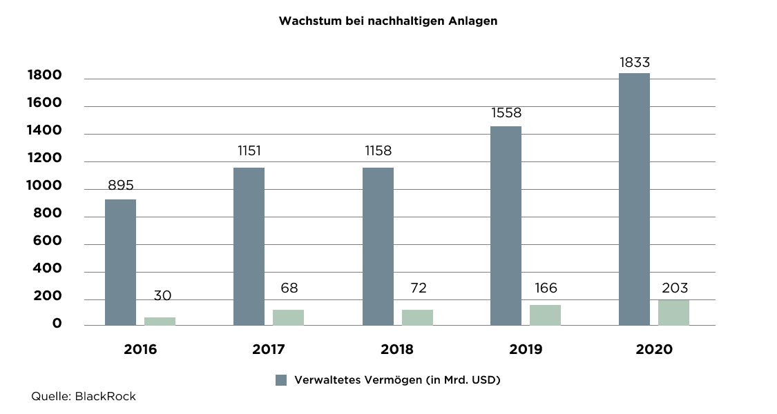 Laut dem «2020 Sustainable Investment Survey» von BlackRock ist das passiv verwaltete nachhaltige Fondsvermögen von USD 895 Mrd. im Jahr 2016 auf USD 1’833 Mrd. im Jahr 2020 gestiegen. Bemerkenswert ist, dass sich die jährlichen Nettoallokationen von USD 30 Mrd. im gleichen Zeitraum fast um das 5,8-Fache auf USD 203 Mrd. erhöhten.