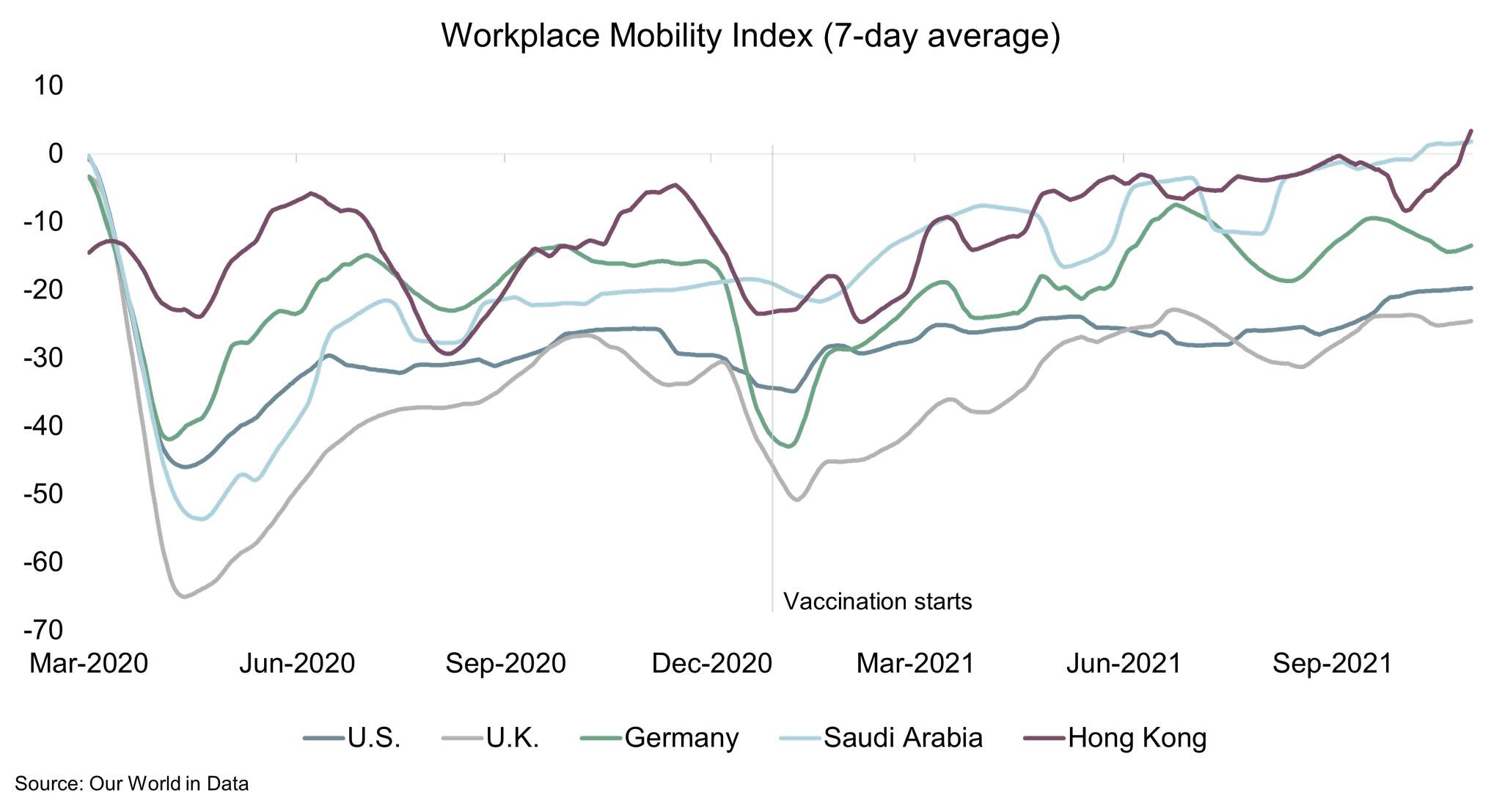 The remarkable speed at which Covid-19 vaccines were developed and rolled out has allowed economies to reopen. The following chart shows that life has almost returned to normal in several developed countries.