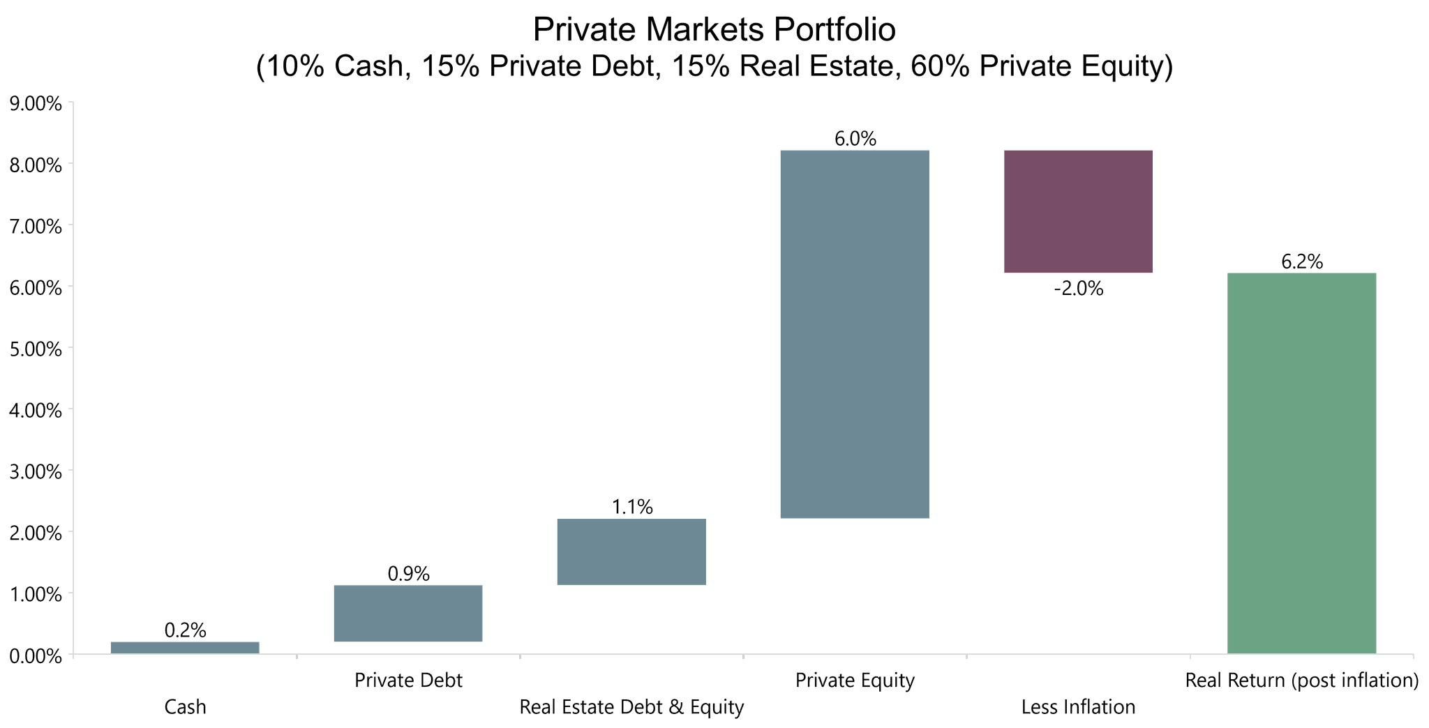 The equivalent of a balanced portfolio with 40% fixed income and 60% public equities in the private markets is expected to generate a nominal return of 8.2% or 6.2% in real terms (see chart below). Private equity is expected to be the largest contributor of return in a diversified private markets portfolio, hence our overweight to this asset class in a diversified private markets portfolio.