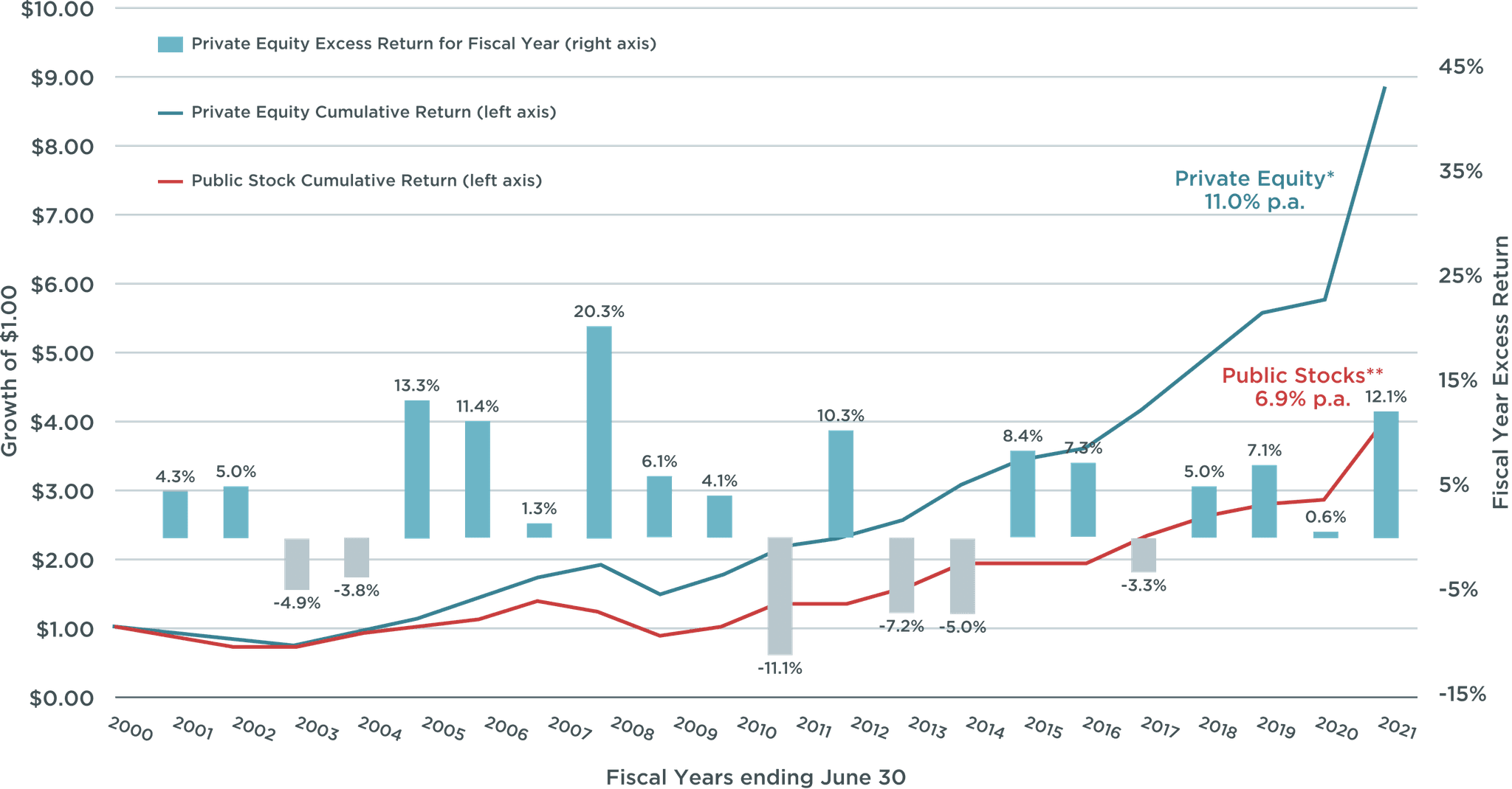 “Over a 21-year time period ending June 30, 2021, private equity allocations by state pensions produced a 11.0% net-of-fee annualized return, exceeding by 4.1% the 6.9% annualized return that otherwise would have been earned by investing in public stocks.”