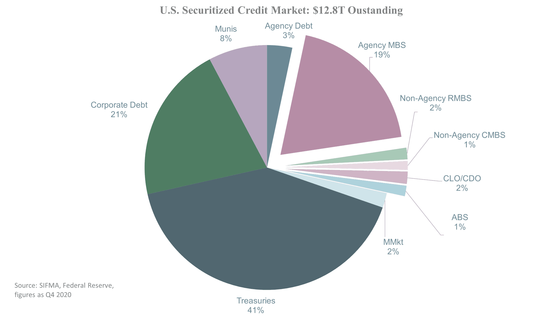 The U.S. securitization market comprises around 25% of the total U.S. fixed income market and consists of a diverse subset of securitization types. The largest relates to commercial and residential MBS securities, either agency or non-agency, representing $11.2 trillion. The market also encompasses collateralized loan obligations (CLOs), i.e securitized pools backed by 1st lien corporate loans, and asset backed securities (ABS), i.e securities collateralized by loans or leases on a variety of alternative consumer, commercial, or whole business assets. Common examples among consumer assets are auto loans and students loans, while common among commercial are shipping containers and aircraft. The asset class thereby offers a large, diversified investment opportunity across the full scope of the economy.