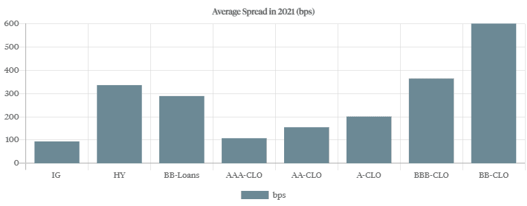 The higher yields in structured products today are well observed in the recent new issuance market. The following graph shows the 2021 average spreads in the U.S. of new issue CLOs versus investment grade bonds, high yield bonds and senior secured loans. For example, the average of the investment grade tranches of new issue CLOs is 207 bps, versus the 94 bps of investment grade bonds. Likewise, BB CLOs have an average spread of 600 bps versus the 336 of high yield bonds and 289 bps of BB senior secured loans.
