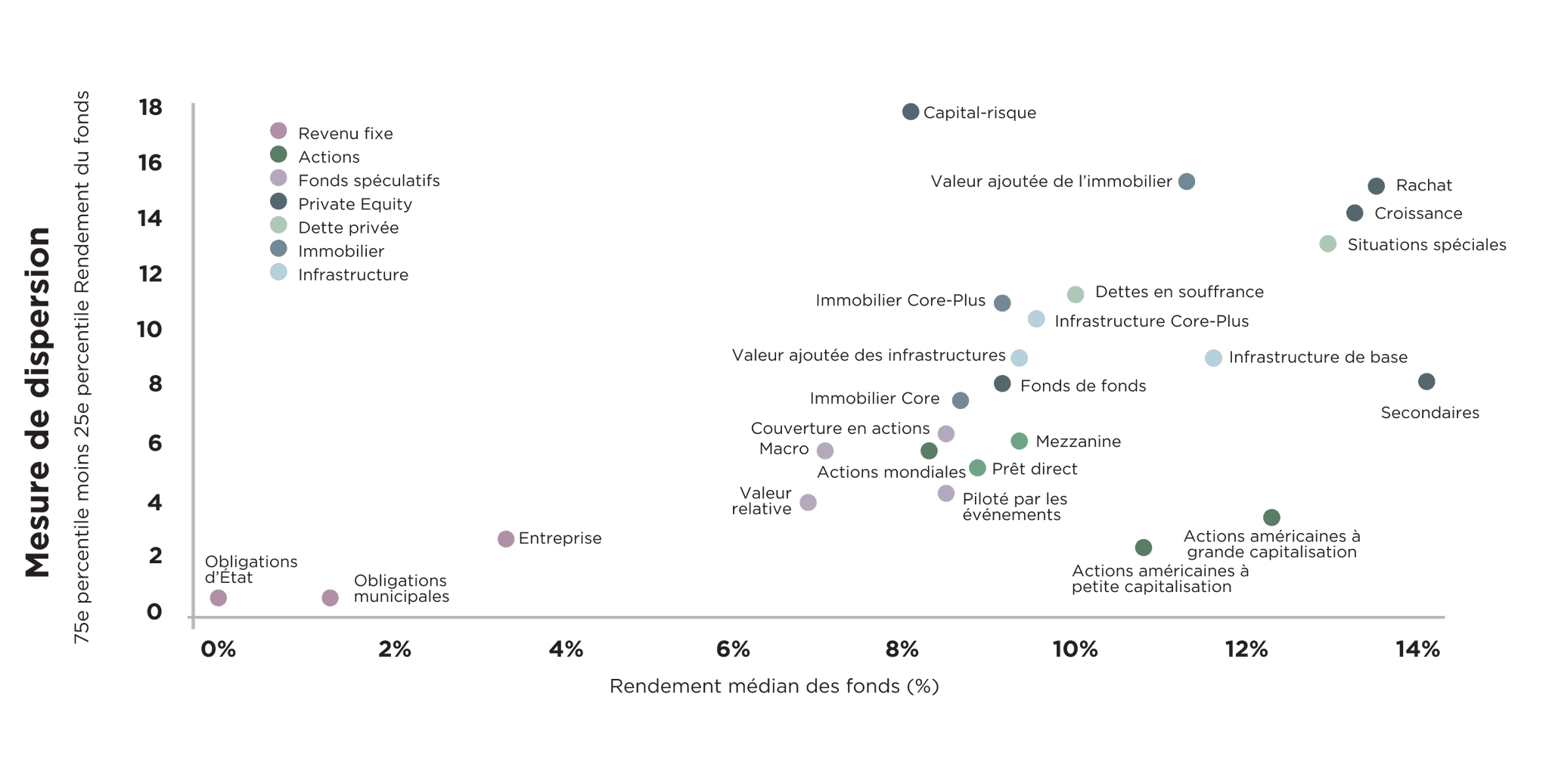 Imaginez les marchés publics comme un pic étroit, où la plupart des rendements se concentrent autour de l’indice. Les marchés privés, eux, ressemblent à un vaste plateau : certains gestionnaires y réalisent des gains considérables, tandis que d’autres restent à la traîne.