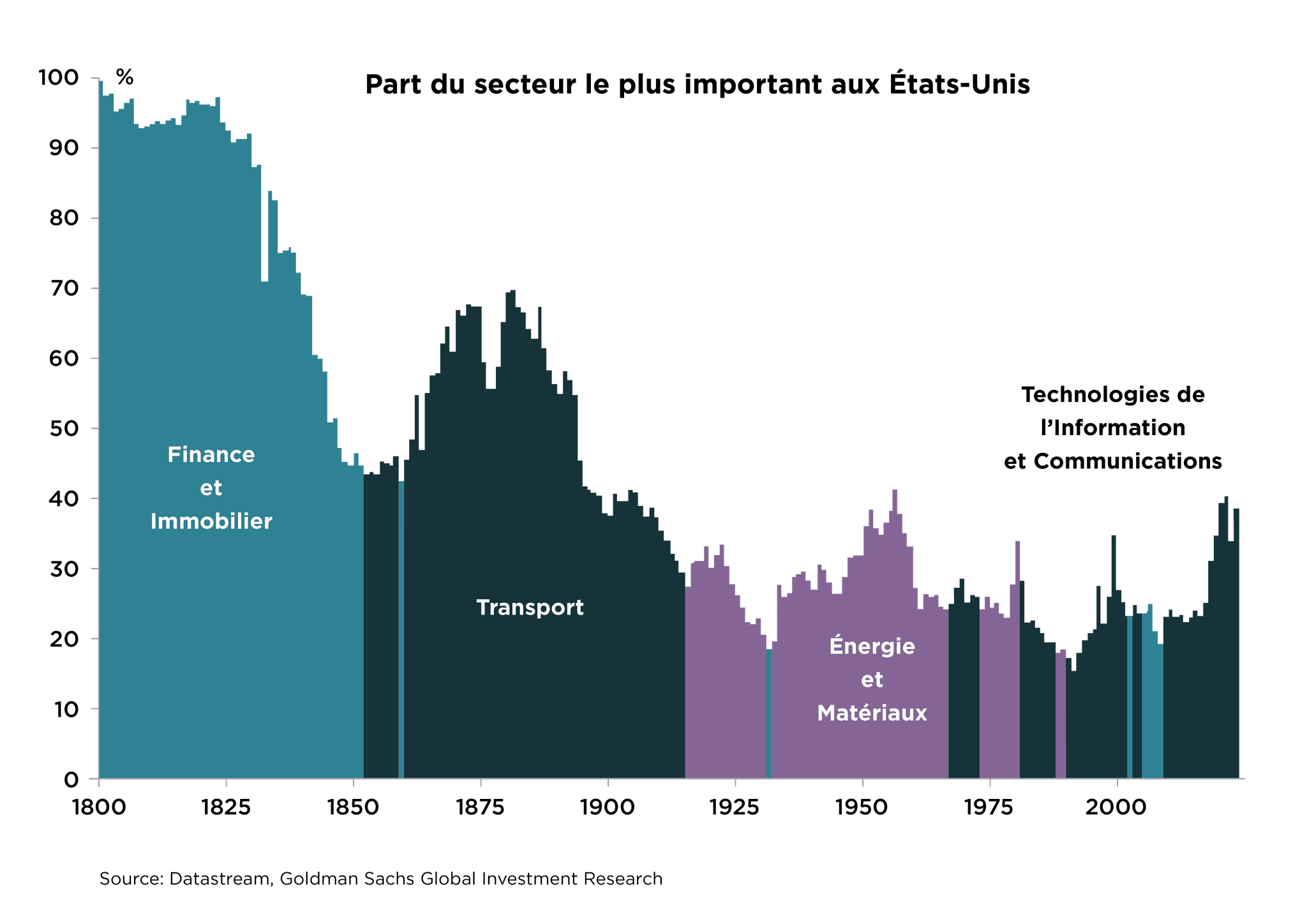 Un graphique de Goldman Sachs l’illustre clairement[1] : dans les années 1800, la finance et l’immobilier détenaient la plus grande part de marché. Au début des années 1900, le transport a pris le dessus. Au milieu du XXe siècle, l’énergie et les matériaux étaient au premier plan et, aujourd’hui, ce sont les technologies de l’information et les communications.