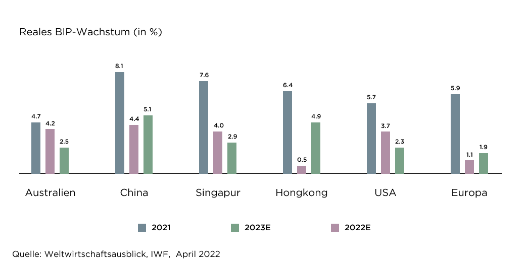 Nach einer Reihe von Lockdowns im ganzen Land und der dynamischen Null-Covid-Politik in der 1. Hälfte des Jahres 2022 wurde im Juni eine Lockerung der Massnahmen angekündigt, darunter eine kürzere Quarantänezeit. In den nächsten Monaten, in denen mit einer weiteren Lockerung der Reisebeschränkungen in China gerechnet wird, dürfte das chinesische BIP dank der relativ niedrigen Inflation, der günstigen Geldpolitik und der starken Exporte wieder wachsen.