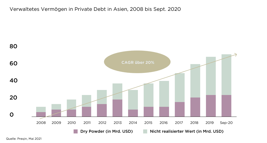 Preqin schätzt, dass sich das verwaltete Vermögen im Bereich Private Debt in der Region Asien-Pazifik im 3. Quartal 2020 auf USD 65,6 Mrd. belief, verglichen mit USD 595,6 Mrd. in den USA und USD 289,5 Mrd. in Europa. Das verwaltete Vermögen in der Region hat seit 2008 mit einer jährlichen Wachstumsrate von mehr als 20% zugenommen. Wir gehen davon aus, dass sich dieser Trend wie in Europa und den USA fortsetzen und sogar noch weiter verstärken wird.