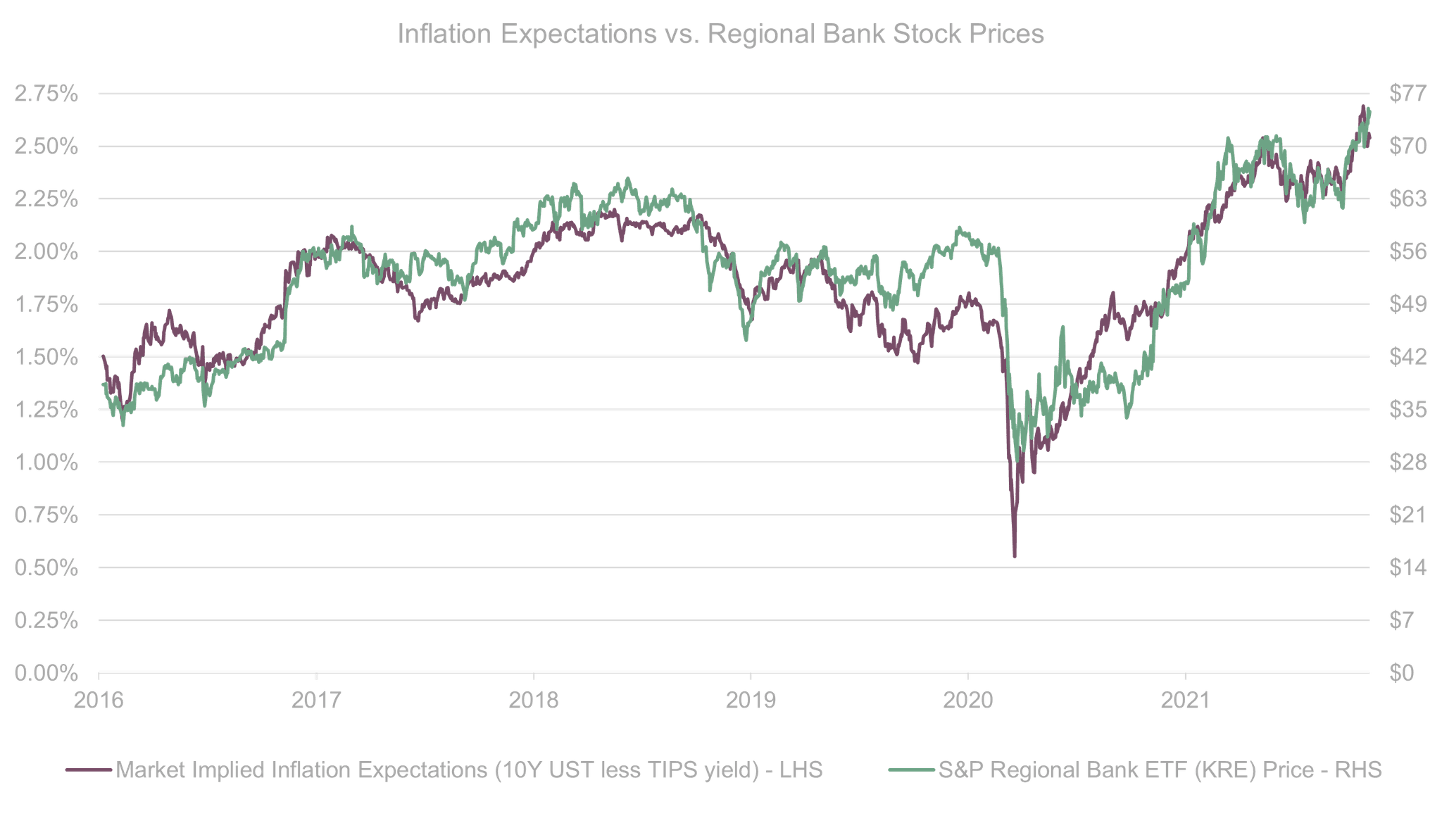 A Fed tightening signals a robust economic recovery with rising inflation, which would benefit banks. The graph below shows that the price of regional bank stocks has closely followed inflation over the past years. Bank stocks are a great inflation hedge, and the market expectations for future inflation are currently pointing north.