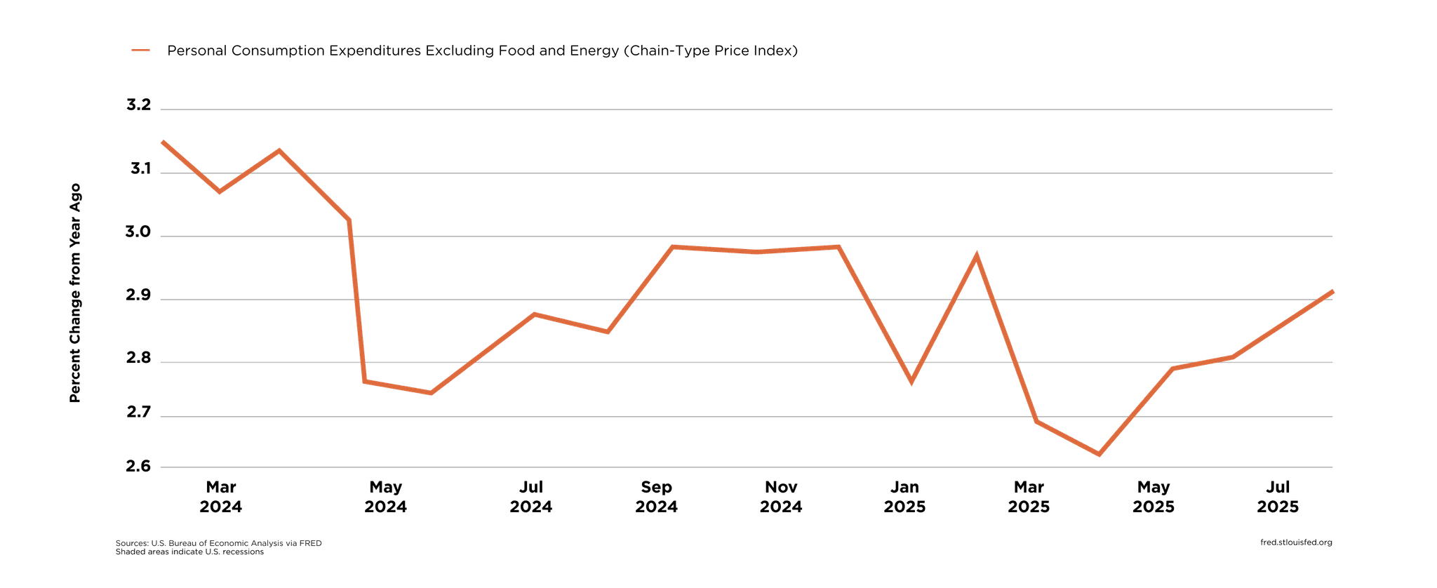 Core PCE inflation, the Fed's main measure, has been rising since hitting a low of 2.6% in April. The "Nowcast" from the Federal Reserve Bank of Cleveland shows that inflation is currently around 2.9%, still almost a full percentage point above the Fed’s target.