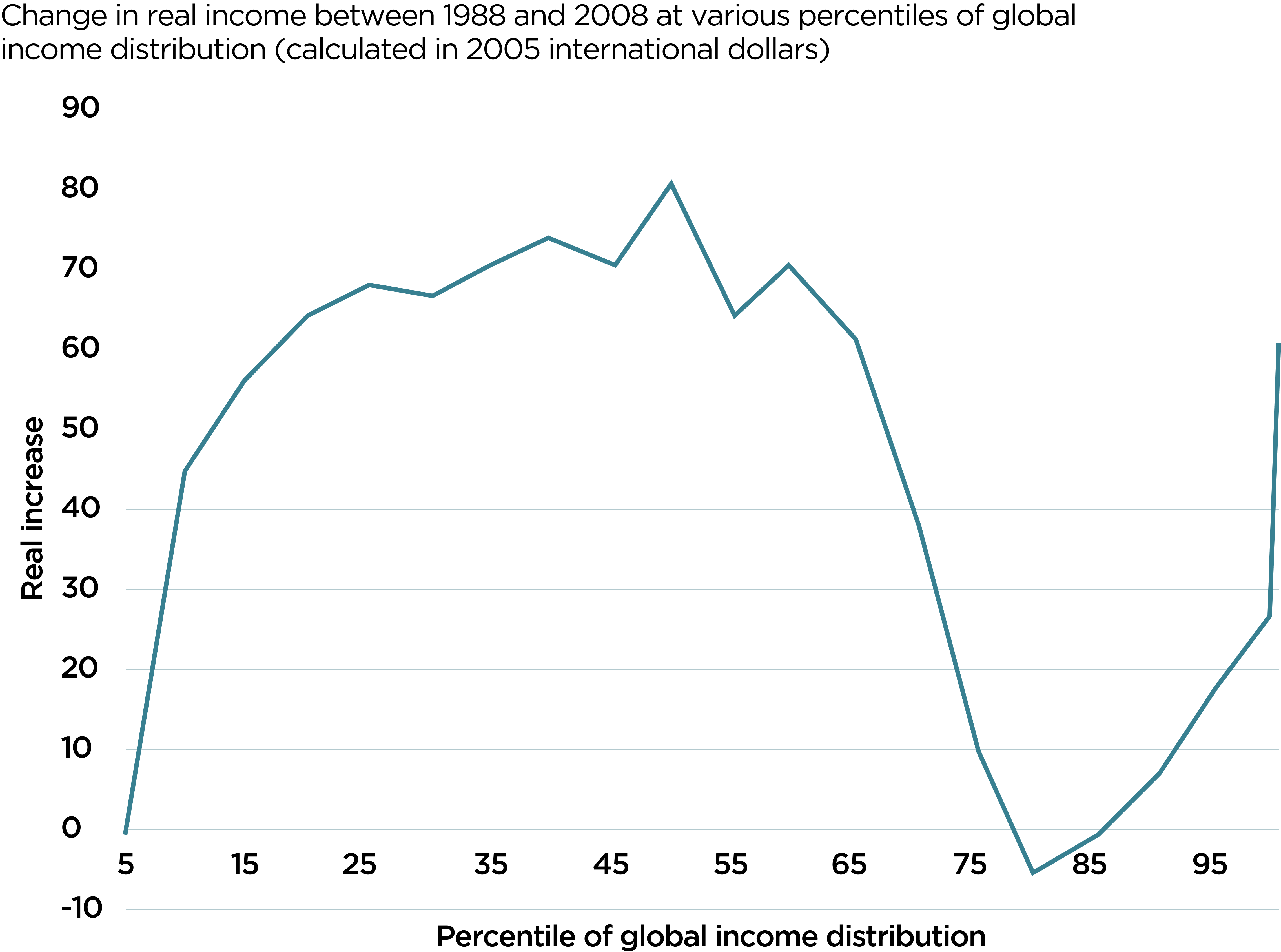 The trough on the right-hand side, which reaches its lowest point in the 80th percentile of global income, includes the semi-skilled labor class in Western economies (e.g. manufacturing, automotive, electronics), many of whose jobs have been transferred to emerging markets.
