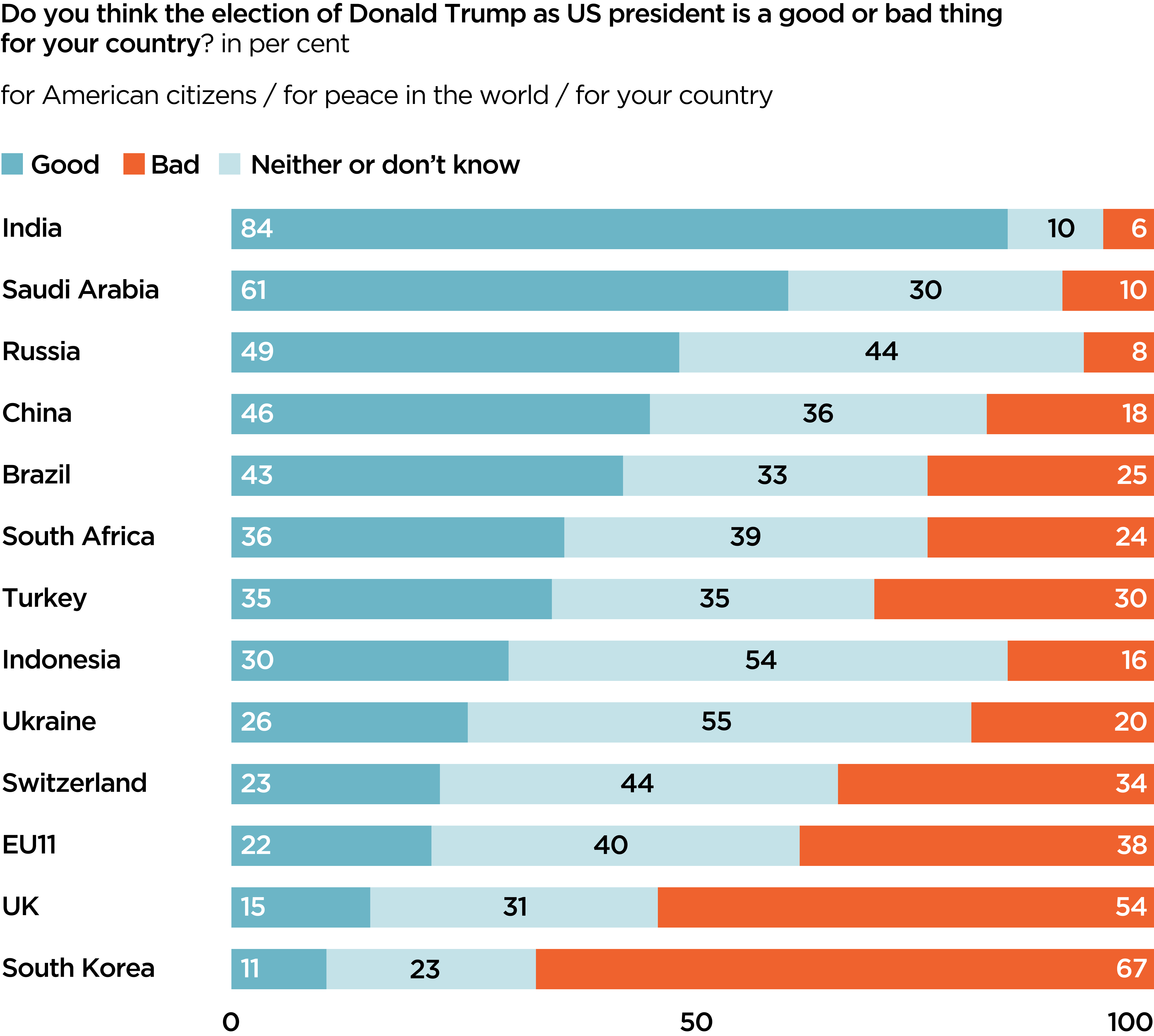 The chart below, based on a poll of 28,549 people across 24 countries, shows a range of opinions. It also shows that it is Western or Western-aligned countries (e.g. South Korea) who take the most pessimistic view of the election outcome.