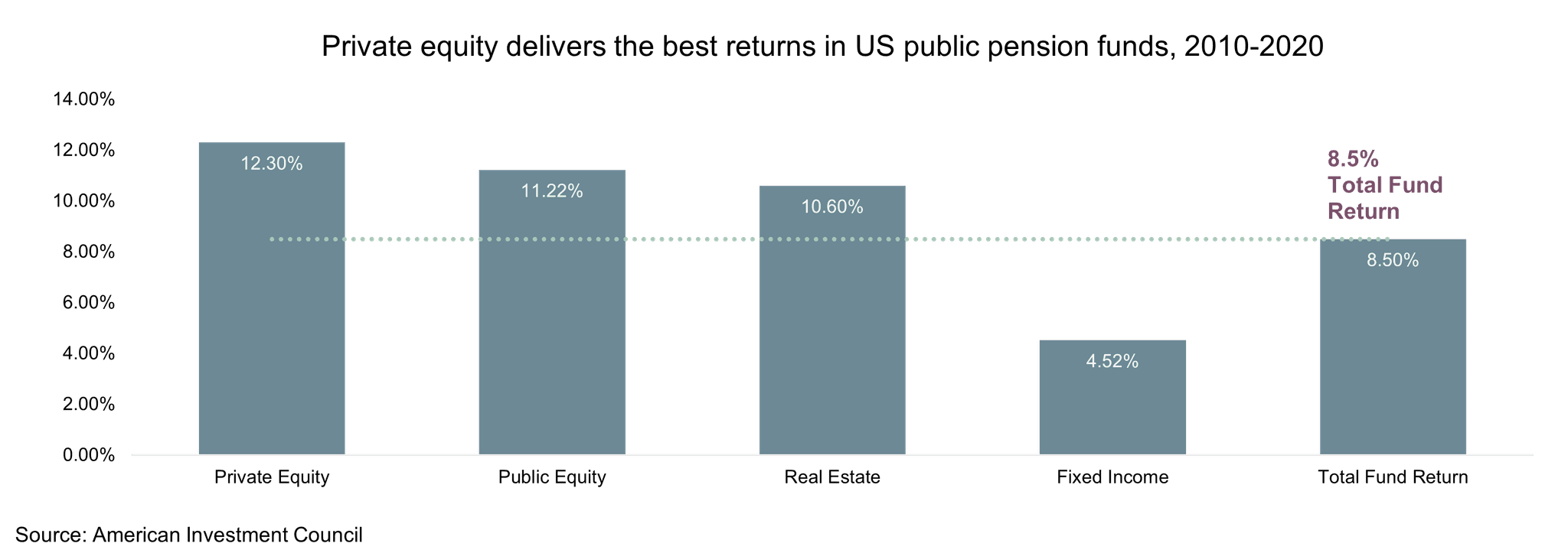 The most persuasive argument for pension funds to invest in private equity is the latter’s ability to provide good returns on an absolute and relative basis. US public pension funds, for example, generated more than 12% annualized return from their private-equity investments, net of fees, between 2010 and 2020, according to the American Investment Council. That made private equity the best-returning asset class for public pension portfolios over the period.