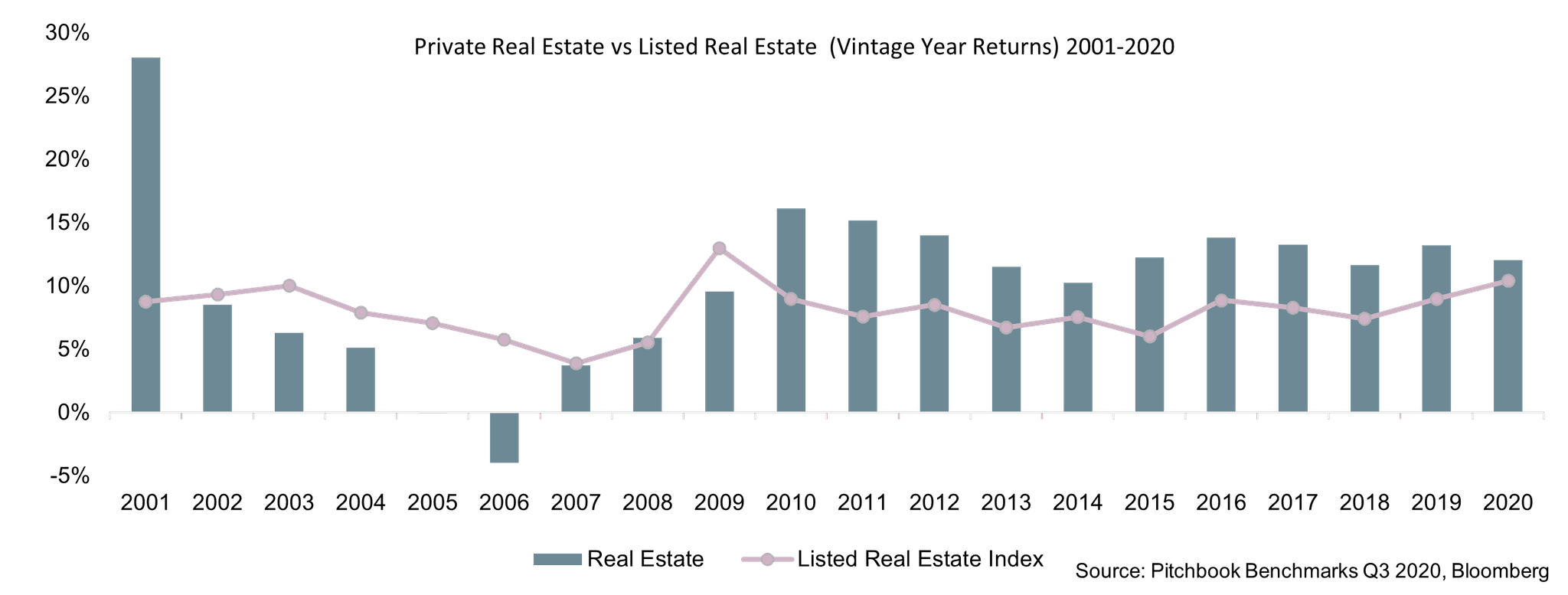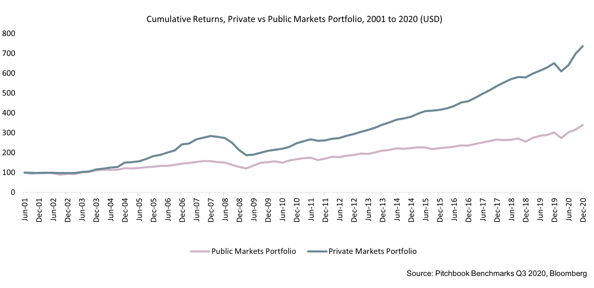 The higher rewards generated by private markets have been consistently demonstrated over much of the past two decades. Since 2001, the returns achieved by investing in a diversified private-markets portfolio have been double those of a public markets portfolio.