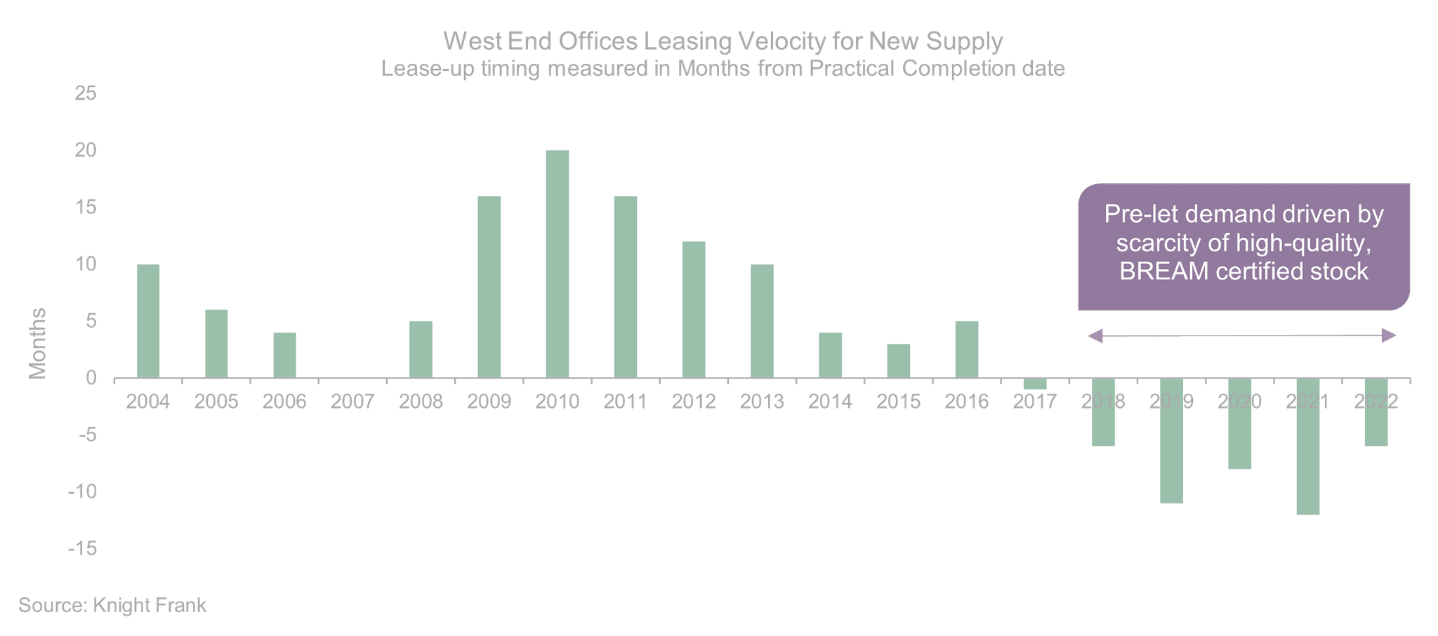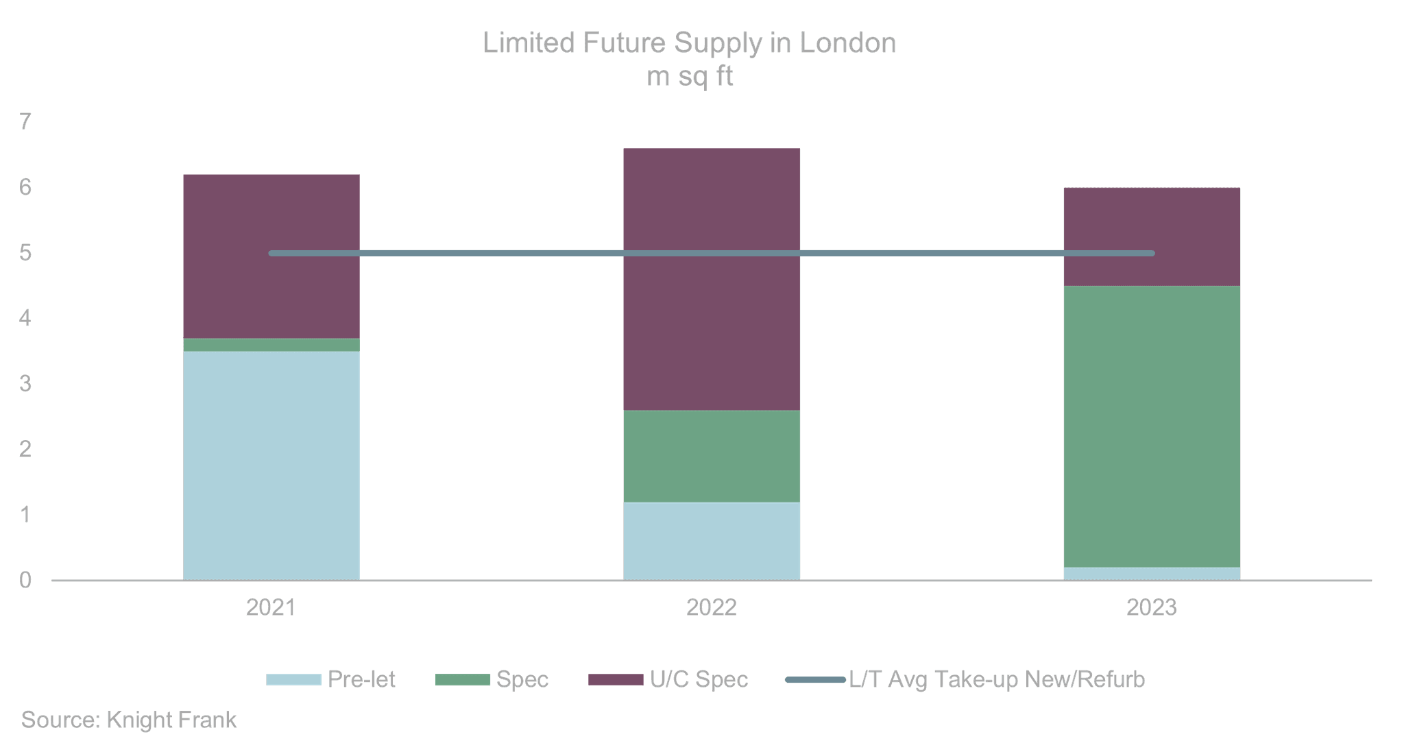 Knight Frank' analysis of the development pipeline data shows c.19.1m sq ft of completions in 2021-2023 and pre-lets comprise 27% of this total. Therefore, c.14m sq ft of space is speculative of which 6.4m sq ft are pipeline schemes that have not been started and may not complete during the next three years. This leaves c.7.5m sq ft of speculative space which is currently under construction and compares to a three-year average take-up of new and refurbished space of c.15m sq ft.