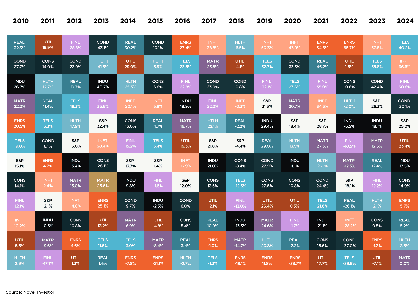 Cette tendance se reflète dans les tableaux de performance sectorielle, où différents secteurs alternent entre le haut et le bas de l’échelle chaque année, avec peu de cohérence. La technologie peut être en tête une année et à la traîne l’année suivante, tandis que des secteurs moins en vue comme les services publics ou les biens de consommation de base surperforment discrètement en période de ralentissement.